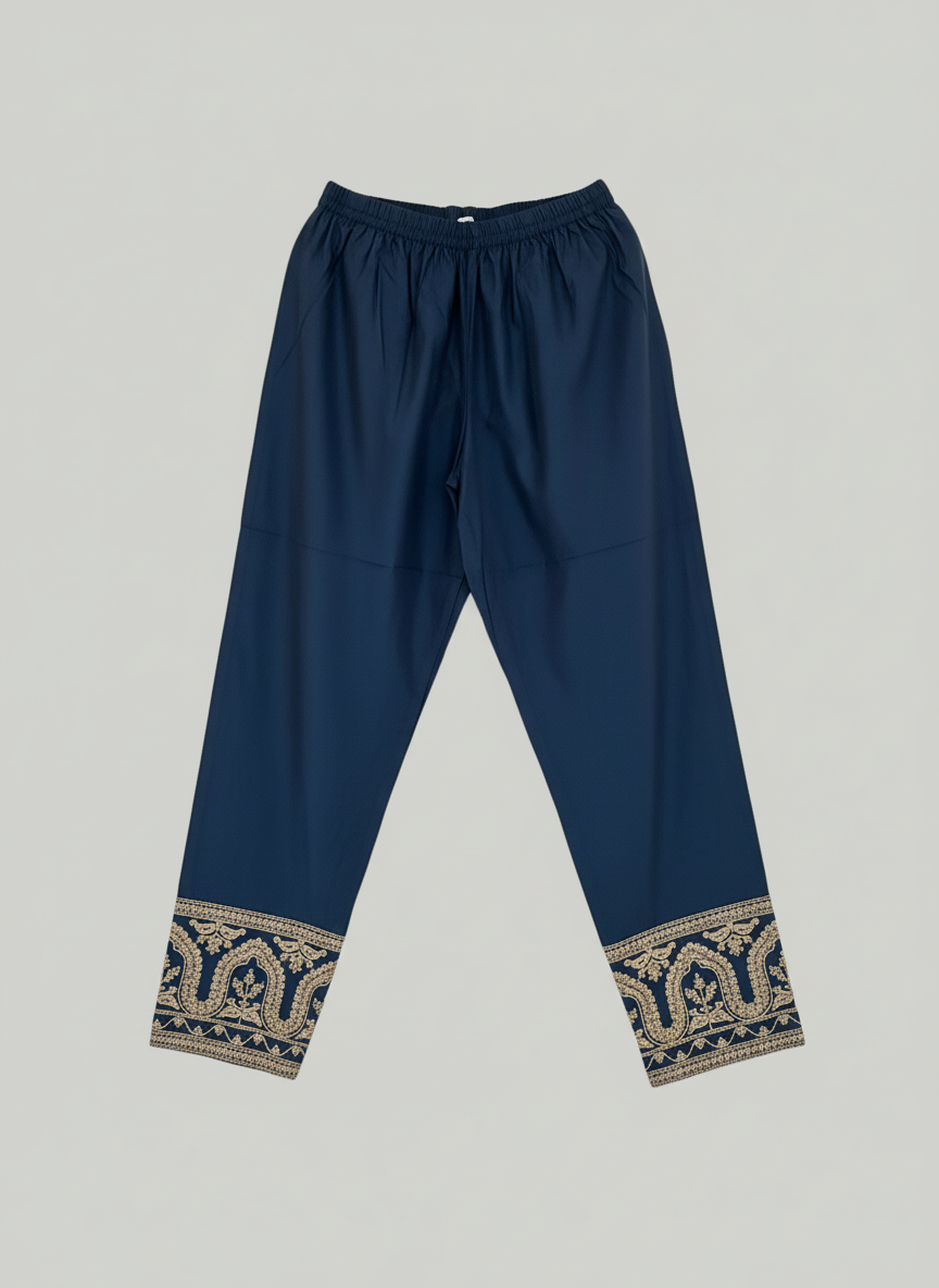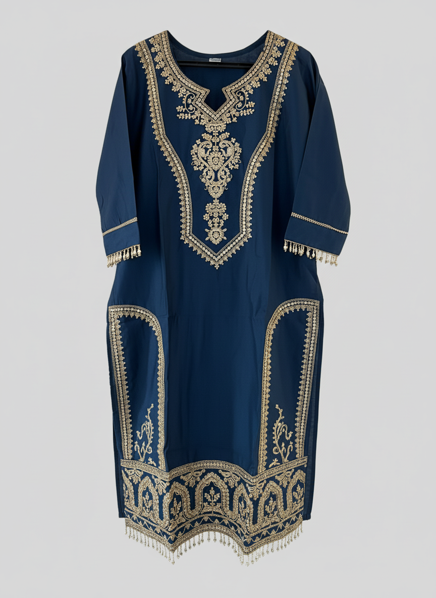 Step into timeless luxury with this navy-blue suit, adorned with gold embroidered motifs and an intricately printed dupatta. The detailed hem and cuff work lend an opulent touch, while the relaxed silhouette ensures both comfort and style. Ideal for evening functions, dinner parties, or special occasions.